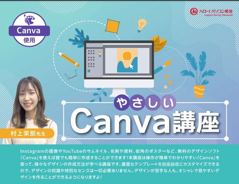 基本的な画像にテキストや装飾素材を追加、テンプレートの使用方法まで基本的なCanvaの操作を学びます。